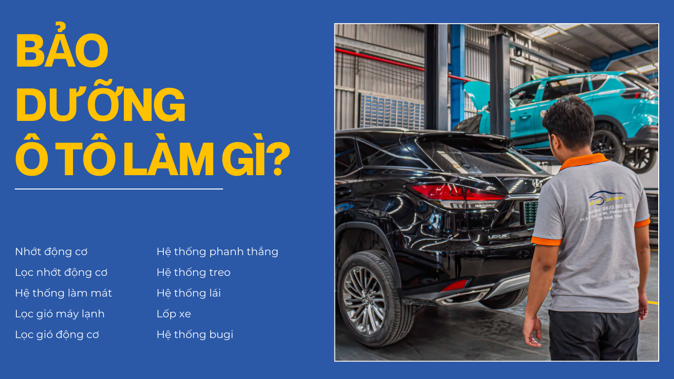 Bảo dưỡng ô tô là quy trình kiểm tra, chăm sóc và thay thế các chi tiết tiêu hao (như dầu nhớt, các loại lọc, má phanh...) theo tiêu chuẩn của nhà sản xuất. Đây là hành động "phòng bệnh hơn chữa bệnh", giúp xe luôn duy trì phong độ như lúc mới mua.